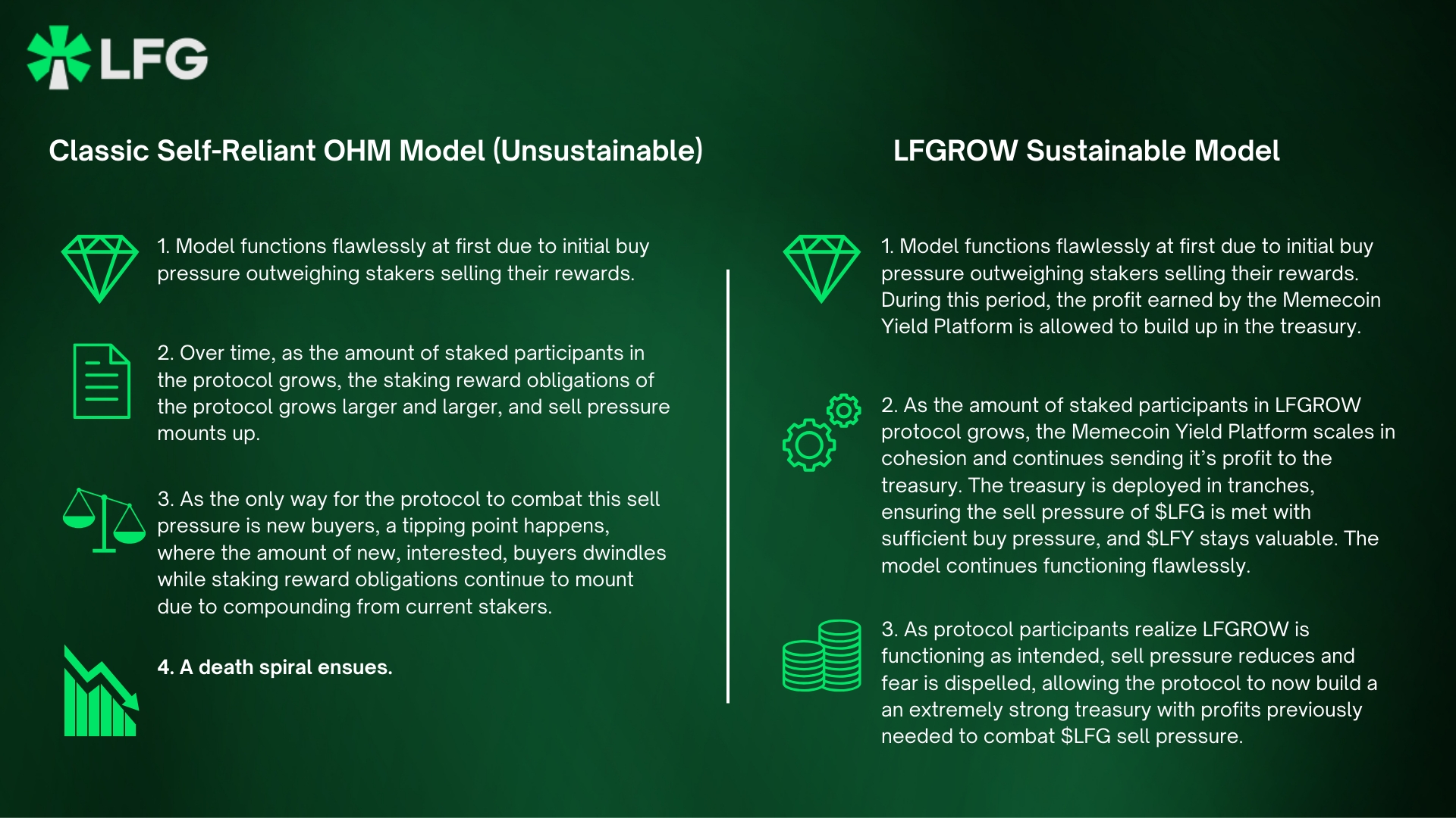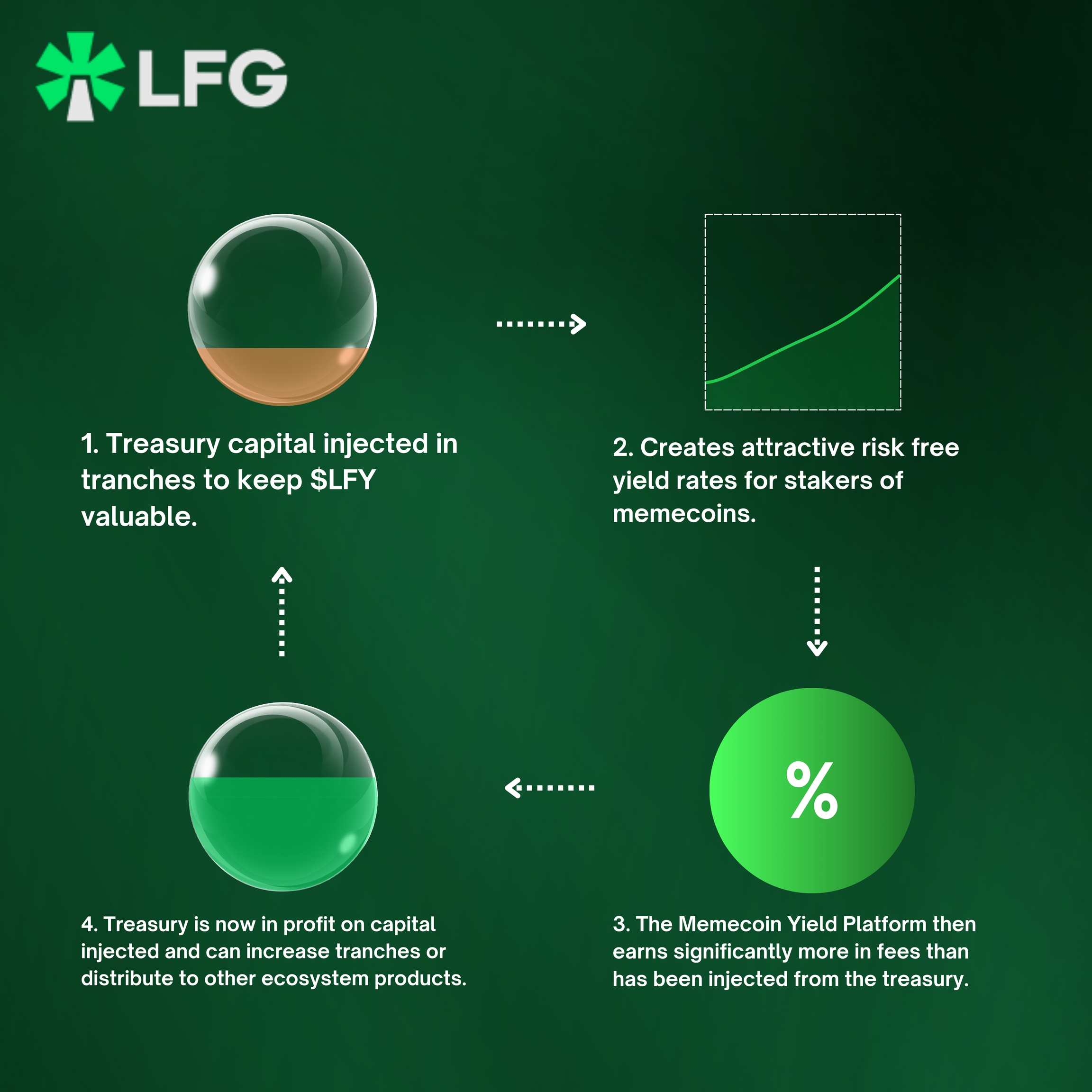 This profit the protocol generates is then added to the LFGROW treasury and ultimately utilized to combat the sell pressure on $LFG. The innovation of the Meme Coin Yield Platform is that it is completely scalable, with the $LFG token itself as the offer of risk free profits for otherwise idle assets earning no yield allows us to accrue large TVL inflow immediately.